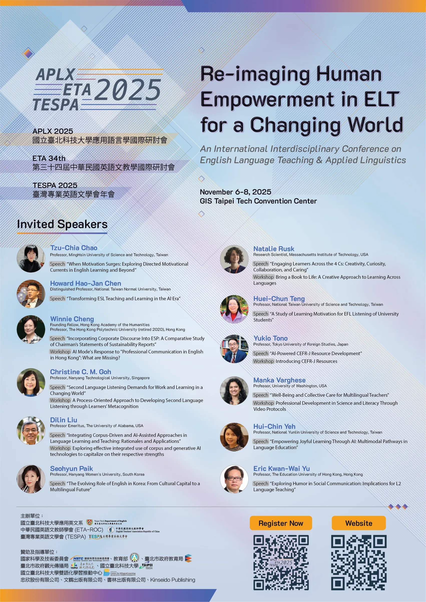 國立臺北科技大學應用英文系與中華民國英語文教師學會(ETA)、台灣專業英語文學會(TESPA)共同舉辦「第三十四屆中華民國英語文教學國際研討會暨國立臺北科技大學應用語言學國際研討會暨臺灣專業英語文學會年會」歡迎踴躍報名參加。